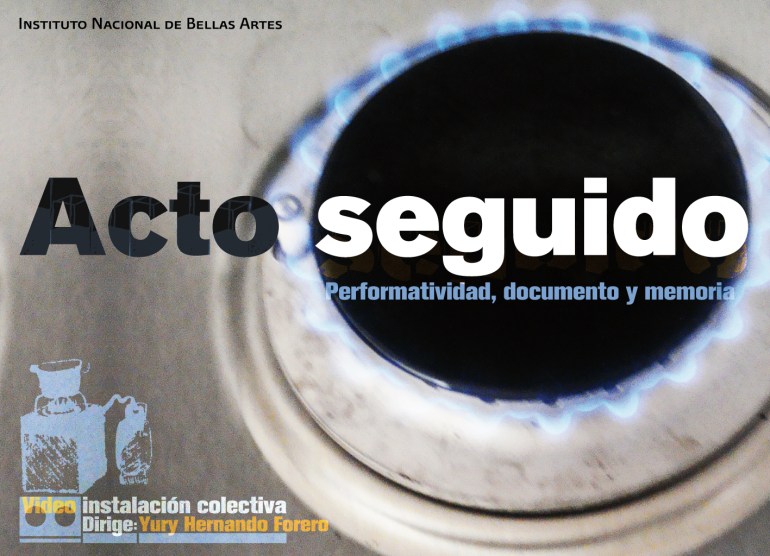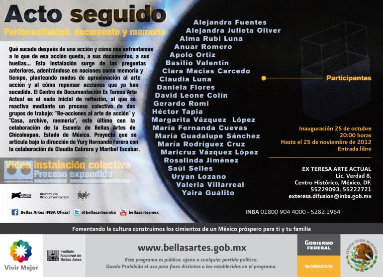 Qué sucede después de una acción y cómo nos enfrentamos a lo que de esa acción queda, a sus documentos, a sus huellas… Esta instalación surge de estas preguntas, adentrándose en nociones como memoria y tiempo, planteando modos de aproximación al arte acción y al cómo repensar acciones que ya han sucedido. El Centro de Documentación Ex Teresa Arte Actual es el nodo inicial de reflexión, al que se reactiva mediante un proceso colectivo de dos grupos de trabajo: «Re-acciones al arte de acción» y «Casa, archivo, memoria», este último con la colaboración de la Escuela de Bellas Artes de Chicoloapan, Estado de México. Proyecto que se articula bajo la dirección Yury Hernando Forero con la colaboración de Claudia Cabrera y Maribel Escobar.