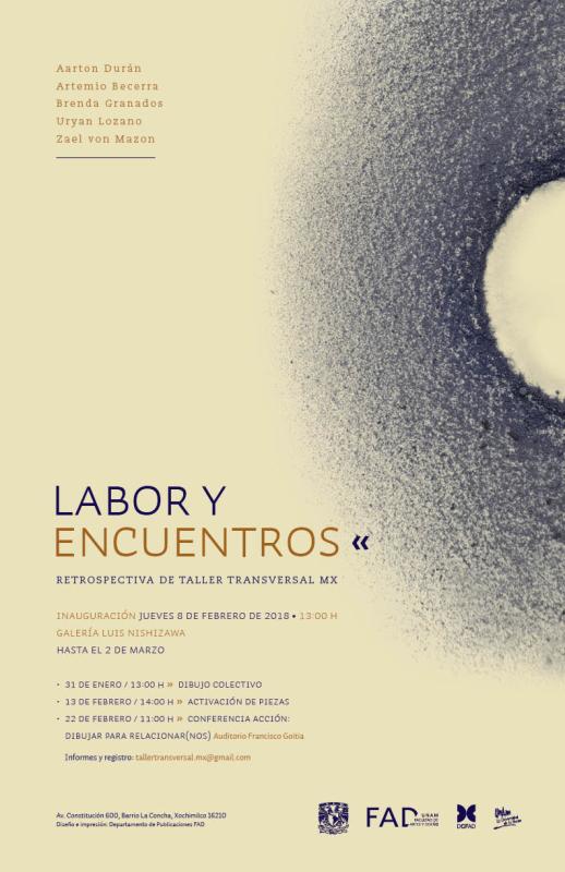 Estas y otras preguntas son los detonantes de las piezas exhibidas en la exposición Labor y encuentros, retrospectiva de Taller Transversal Mx. Los miembros de este grupo interdisciplinario se desenvuelven activamente en las áreas del arte, la arquitectura, las ciencias, el diseño, la educación, la gestión cultural y la salud; de esta manera el quehacer de Taller Transversal Mx aboga por los procesos y prácticas interdisciplinarias cuyas salidas van desde: la producción visual y plástica, el trabajo relacional, arte-educación y diseño participativo con comunidades hasta la producción en nuevos medios, así como la creación de nuevos paradigmas transdisciplinarios en el espacio público.